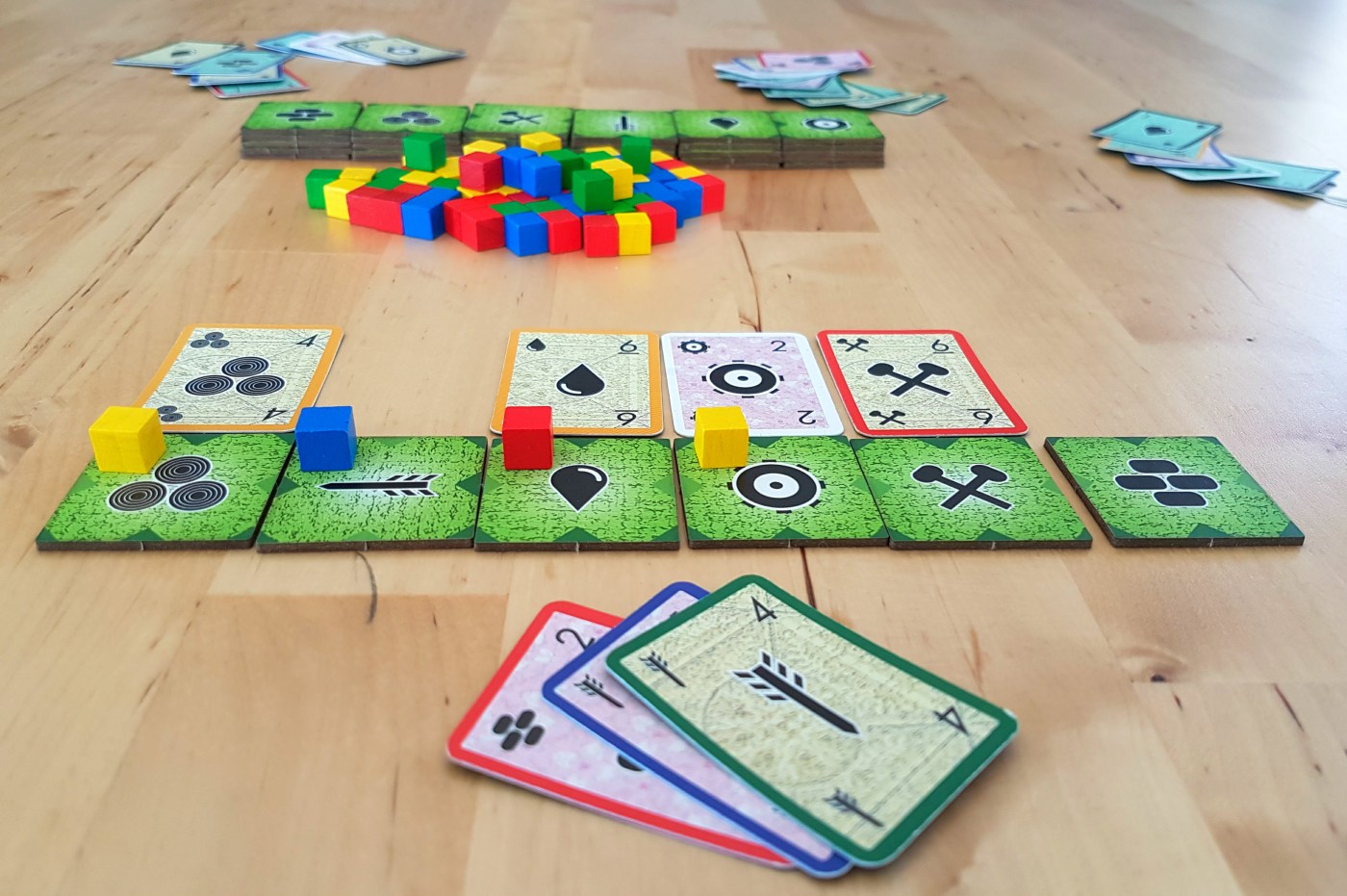 The classic deduction card game Sleuth (Sid Sackson, 1971) has been reimagined for the Green Box. One card is missing from the deck, and you have to interrogate the other players in order to discover which one. Continue reading “Sloth – Game #38”